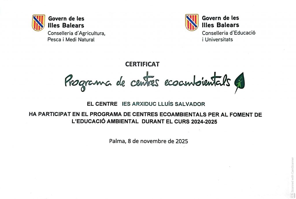 26/11/25L’IES Arxiduc rep un any més el certificat que l’acredita com a Centre Ecoambiental pel seu compromís amb el medi ambient.